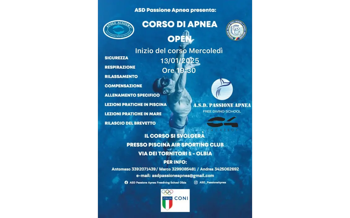 Ci Siamo!!! Data oramai Calendarizzata ,lunedi 13 Gennaio 2025 alle ore 19:30 avrà inizio il corso di Apnea Open con didattica Apnea Academy e Fipsas.